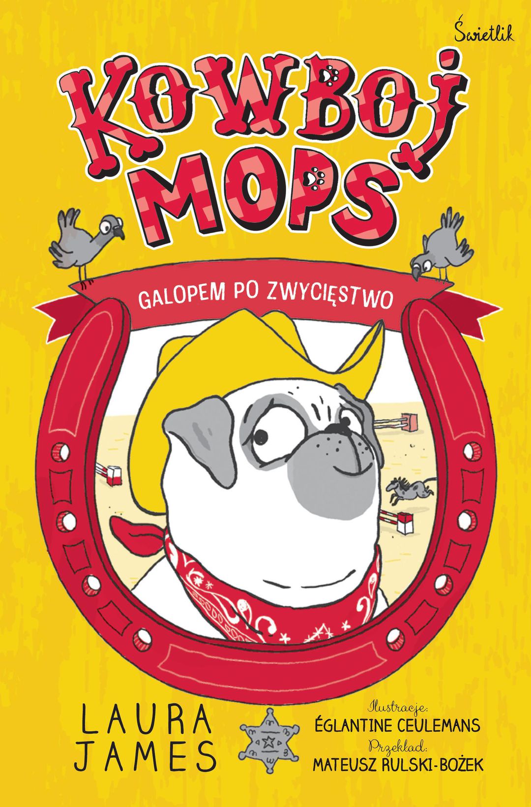 „Przygody Mopsa” autorstwa Laury James to seria zabawnych opowieści o sympatycznym Mopsie i jego opiekunce, Pannie Mirandzie. Tym razem Panna Miranda postanawia, że Mops zostanie kowbojem, i wspólnie wyrusząją na Dziki Zachód, aby pokonać bandytów. Wszystko idzie gładko, dopóki drewniany Kuc nie pęka na pół i dziewczynka ze świata wyobraźni musi wrócić do rzeczywistości, a zniszczona zabawka staje się pretekstem do poszukiwań i zakupu prawdziwego konia. Kiedy Panna Miranda poznaje Konika, zaczynają się dziać niesamowite rzeczy – Mops, jak na prawdziwego kowboja przystało, musi wziąć udział w zawodach w skokach przez przeszkody! Ale co z jego strachem przed jazdą konno? Seria nieoczekiwanych zdarzeń prowadzi do zabawnych sytuacji, wywołując mnóstwo śmiechu podczas czytania.